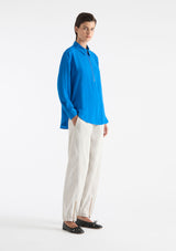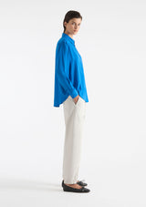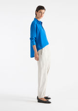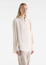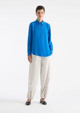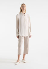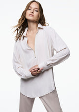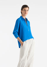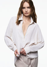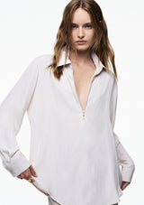 The Zip Front Shirt from Mela Purdie features a crisp collar, half zip closure detail through neckline, full-length sleeves with cuffs, back pleat detailing and slightly a curved hemline. This shirt is crafted from 100% technical polyester, Mache offers a full bodied, high fashion look that combines style and comfort in a user-friendly fabrication, that is machine washable and ideal for travel.