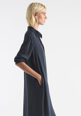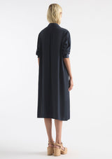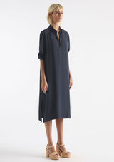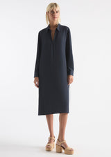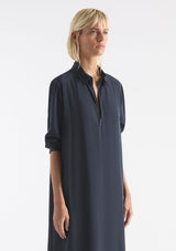 The Zip Wedge Dress from Mela Purdie features a classic collar with zip neck detail, full length sleeves with cuffs, side pockets and finished with a straight hemline with side splits. This elegant dress is crafted from 100% technical polyester. Mache offers a relaxed fluidity & smooth lustre surface that combines style and comfort in a user-friendly fabrication that is machine washable and ideal for travel.