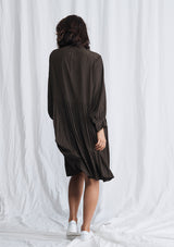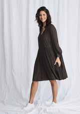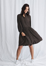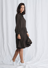 The Choir Dress from Mela Purdie features a mid-length design, ruffled skirt, long sleeves and a high collar with button through front. Crafted from Mela’s non-stretch fabrication, Macro-Mousseline.