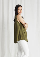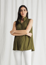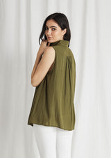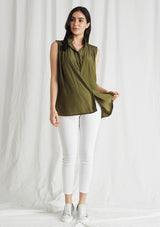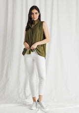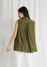 The Cossack Tank by Mela Purdie features in the Macro-Mousseline fabrication. This designer top features a mandarin collar, slight cap sleeve and a button-down front.