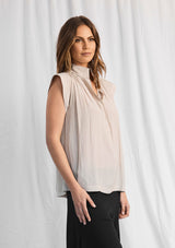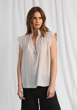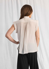 The Dove Tank been crafted from Mela Purdie’s non-stretch fabrication, Macro-Mousseline. The Dove Tank features a slight cap sleeve, v neckline with mandarin collar and a relaxed box-shape silhouette.