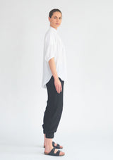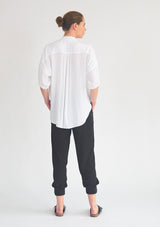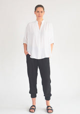 The Gravity Blouse features generous gathering in the front shoulders, dropped sleeves and elasticated sleeve cuff rouching in at the hem. A subtle stand collar on the neckline and front button fastening balance out the drama of the sleeve. Crafted from Macro-Mousseline; a fabric that drapes like a silk but can be machine washed. This is a travel essential and everyday dressing must have.