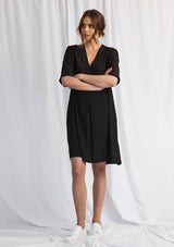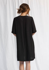 The Parquet Dress is crafted from Mela’s non-stretch fabrication, Macro-Mousseline. The Parquet Dress features a v-neckline, short sleeves, placket detailing on the back and falls to knee length.