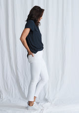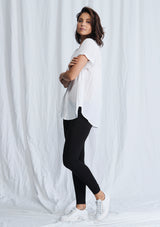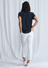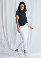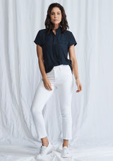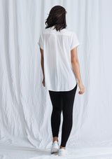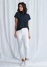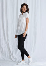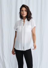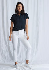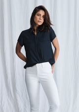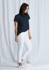 The Mela Purdie Stand Collar Blouse is crafted from Macro-Mousseline, a silky non-stretch fabrication. Ideal for travelling, this top features a button-down front, neat standing collar, and short sleeves.