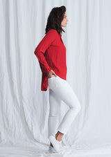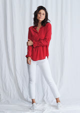 The Valentine Blouse from Mela Purdie features a high collar with ruffled detail, and long sleeves with matching ruffles on the cuff. This blouse is relaxed through the body, and the hemline is rounded with side splits. Crafted from Mela’s non-stretch fabrication, Macro-Mousseline.