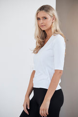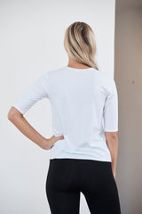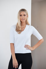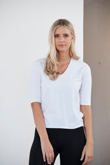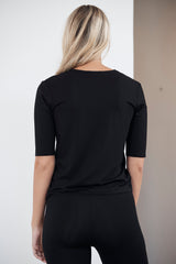 The Elbow Top from Mela Purdie is crafted from Matte Jersey, a stretch fabrication that is machine washable and ideal for travel. This classic V-Neck top features elbow length sleeve, relaxed fit in the waist and falls to hip length.