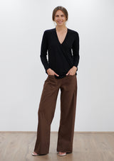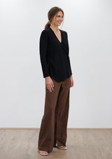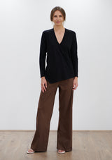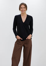The Foldover Top from Mela Purdie features a fastened wrap front and long sleeves. This versatile top is crafted from the renowned matte viscose jersey, offering optimal comfort and stretch.