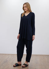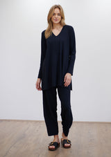 The Scallop Tunic from Mela Purdie features a V-neck with scalloped detail, 3/4 length sleeves and a loose-fitting silhouette with featured side splits. This versatile tunic is crafted from the renowned matte viscose jersey, offering optimal comfort and stretch.
