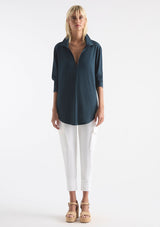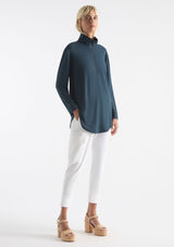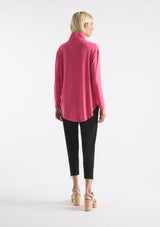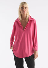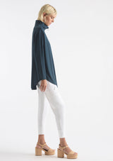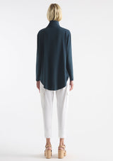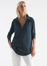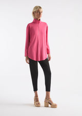 The Zip Front Sweater from Mela Purdie features a high stand collar with zip front detailing, dropped shoulder, full length sleeves and a relaxed silhouette with a scooped hemline. This top is crafted from the renowned matte viscose jersey, offering optimal comfort and stretch.