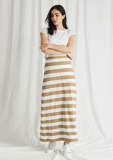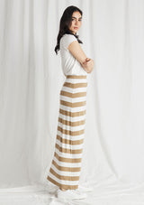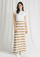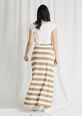 The Mela Purdie Maxi Split Skirt is crafted from a Viscose-Jersey, which is a stretch fabrication. This Skirt features in the Inca Stripe Jersey White, has an elastic waistband, and a straight cut fit with a side split detail.