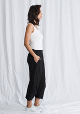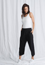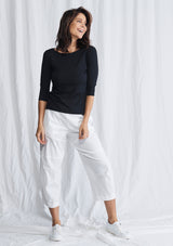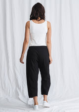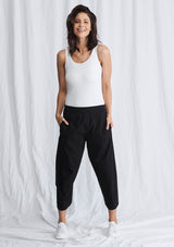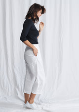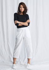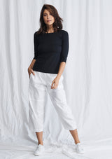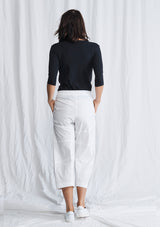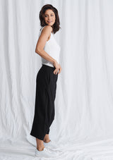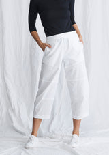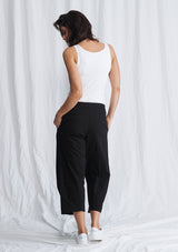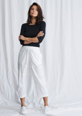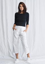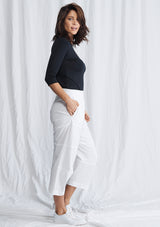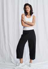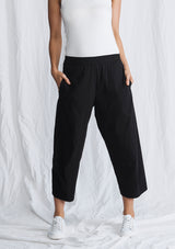 The Mela Purdie Cropped Tuscan Pant crafted from Microprene, a lightweight stretch fabrication that is machine washable and ideal for travel. The Cropped Tuscan features an elasticised waistband designed to sit just above the hips, a puffer wide cropped leg that tapers in, pockets and panel detailing.