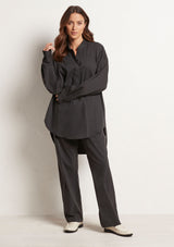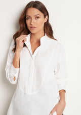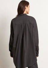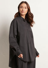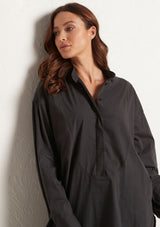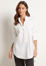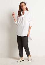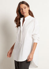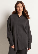 The Relaxed Yoke Shirt from Mela Purdie features a tall stand collar, front yoke panelling with a concealed button front placket, full length sleeves with buttoned shirt cuffs, back yoke with pleat detailing and a high/low curved hemline. Crafted from best-selling Microprene; a lightweight cotton stretch fabrication that is machine washable.