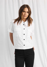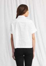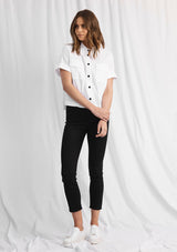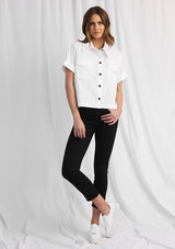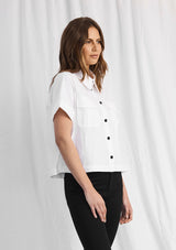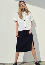 The Savannah Shirt by Mela Purdie features a button up front with collar, short sleeves, pockets and a box shaped silhouette. This designer top is crafted from Mela’s Microprene fabrication.