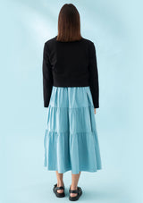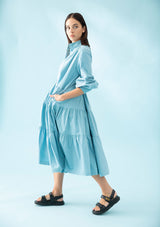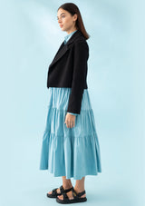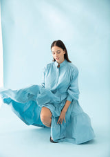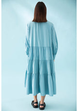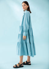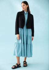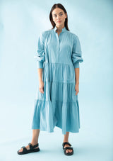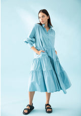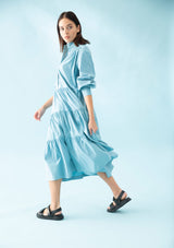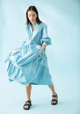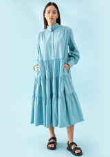 The Souffle Dress from Mela Purdie features a stand collar and concealed button placket. The dress is detailed with gathered shoulders and wide nipped-in cuffs to create blouson sleeves. The voluminous skirt is detailed with soft gathered tiers and functional side pockets. Crafted from Microprene; a lightweight stretch fabrication that is machine washable.