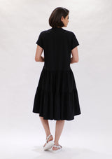 The Traction Dress from Mela Purdie features a full tiered skirt which falls on the knee, v-neckline with button fastening, capped sleeves that sit at a flattering angle and side pockets. This Dress is crafted from Microprene; a lightweight stretch fabrication that is machine washable and ideal for travel.