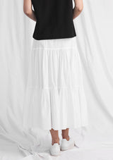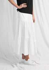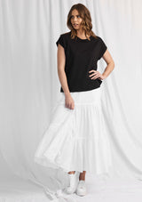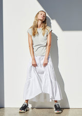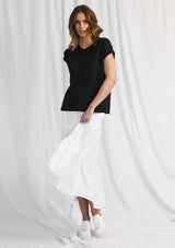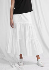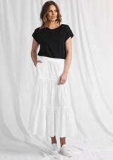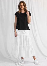 The Mumbai Skirt by Mela Purdie features a mid-length skirt with ruffled detailing and an elastic waistband. This women’s skirt is crafted from a Microprene fabrication which allows for a soft A-Line finish.
