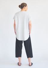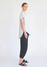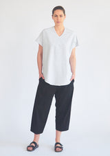 The Mela Purdie Optical Stripe Floating Shell features a soft bound V-Neckline, dropped shoulders, and mixed with generous proportions through the body that pleater off to a flattering exaggerated scooped hemline, scooping up at the side to create an elongating effect. Layer over leggings or Tracks for a modern sweater look.