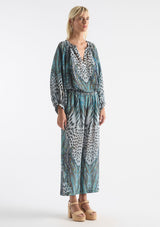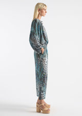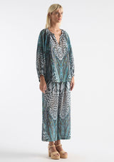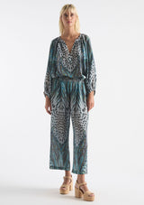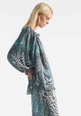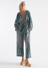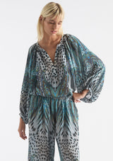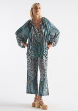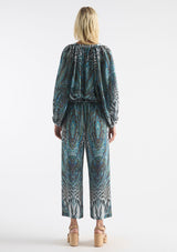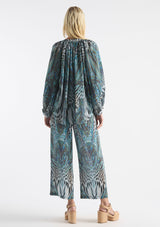 The Escape Blouse from Mela Purdie features a flattering neckline with an option to wear open as a V-neck or single button up for a rounded finish. Gathering and fixed cuffs enhance the billowy shape of the sleeves, allowing you to have some fun with your styling. Cut from the striking Peacock Print; Silk Crepe De Chine is luxuriously lightweight, boasting a sumptuous soft handle, matte surface and beautiful drape.