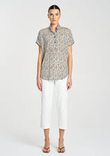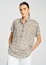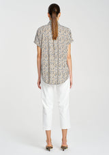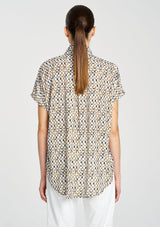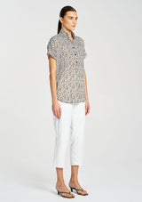 Crafted from Mela Purdie's Stretch Charmeuse, featuring a technical stretch satin and smooth fluid finish. The Tab Stand Shell features a crisp front placket with button closure through the collar.