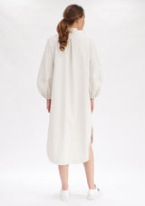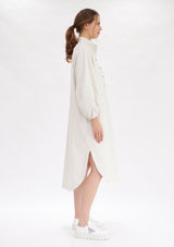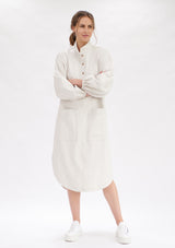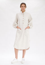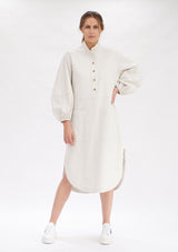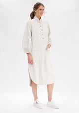 The Mela Purdie Studio Dress is crafted in the newest fabric; Polished Canvas. Polished Canvas is a structural cotton flax blend with a vintage finish that offers comfort and stretch. The Studio Dress is detailed with an artistic stand collar and split at neckline with a buttoned tab, puff sleeves and a scooped hem. Stitched panelling throughout and finished with utility patch pocketing on the front for a polished yet casual look.