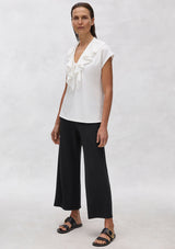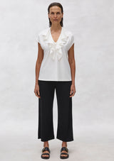The Wave Shell from Mela Purdie features a v-neckline with soft ruffle detail, cap sleeves and a relaxed fit that falls to the hip. Crafted from Mela Purdie's matte Powder Knit, this versatile top offers a unique blend of softness and subtle structure. The matte finish provides a refined look, while the stretch ensures a comfortable, flattering fit that moves with you.