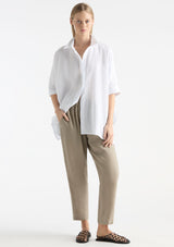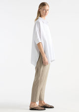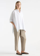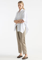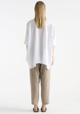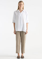 The Chisel Panama from Mela Purdie features a collar, concealed front placket with button closure, elbow length sleeves and a slighter longer A-line swing hem with side split openings. This shirt is crafted from a breathable, mid weight European Pure Linen with a subtle weave offering a boxy fit through the body and sleeve.