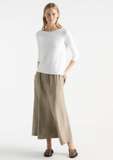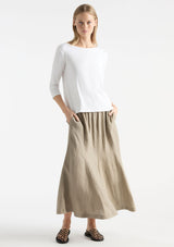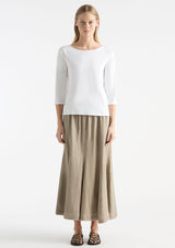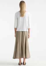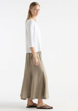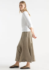 The Palazzo Skirt from Mela Purdie features an elasticated waistband, pockets at hips and fit and flared silhouette with gored panel detailing. This midi length skirt is crafted from high quality European linen, with a hint of texture and a beautiful light airy feel, a contemporary addition to your summer wardrobe.