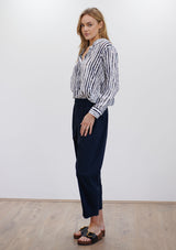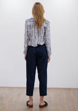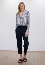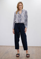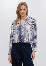 The Soft Shirt by Mela Purdie has been designed in the Quill Stripe Print. This classic silhouette features an open collar, button front with cover, and long sleeves with button cuff. Crafted from printed 100% Silk.