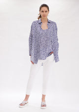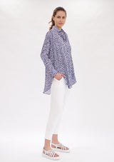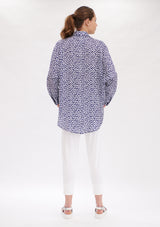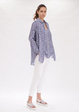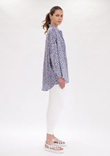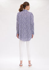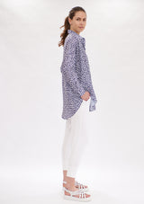 The Mela Purdie Limitless Shirt features dropped shoulders, generous silhouette and a curved hemline. The front has a concealed button packeting, shirt collar and shirt cuff detailing to accentuate a tailored finish. Featured in the Indigo Reef Print, this top is crafted from Chiffon Satin; a light- weight non-stretch fabrication, that offers a subtle satin finish.
