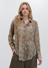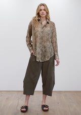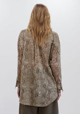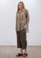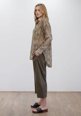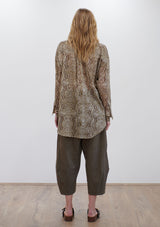 The Hero Shirt by Mela Purdie has been designed in Reptile Silk Cotton Voille. It features a collar with button down front opening, single pocket detail and long sleeves with a scooped hem. This shirt is crafted from printed silk/cotton; a non-stretch fabrication.