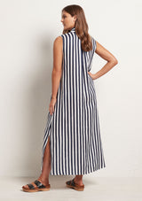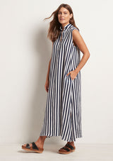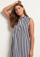 The Ribbon Stripe Linen Tab Slide Dress from mela Purdie features a petite stand collar and firm button placketing through the front. This sleeveless midi dress is comfortable and flattering with pockets and side splits offer extra movement. This effortlessly chic dress is set become a season favourite. Crafted from high quality European linen, Mela’s Ribbon Stripe adds a hint of texture with a light airy feel.