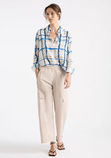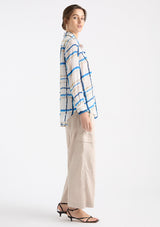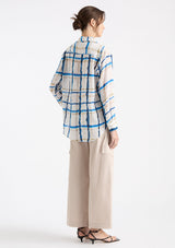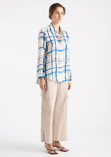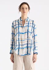 The Soft Shirt by Mela Purdie features a classic shirt collar, concealed button front placket, full length sleeves with buttoned shirt cuffs, back yoke with pleat detailing and a curved hemline. Cut from the vibrant Riviera Check Print; Silk Crepe De Chine is luxuriously lightweight, boasting a sumptuous soft handle, matte surface and beautiful drape.