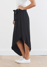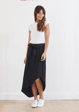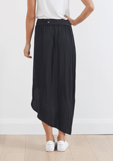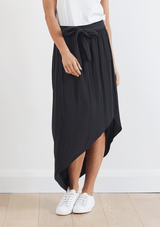 The Samurai Skirt will become the new staple piece in your wardrobe. This simply elegant skirt has a tie-waistband and features soft angled hemline with split detailing on side. Crafted from Mela’s charming addition to the technical polyester family; Mache. Mache offers a fuller bodied, high fashion look that combines style and comfort in a user-friendly fabrication that is machine washable and ideal for travel.
