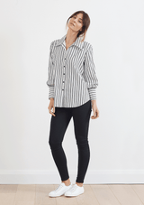 The Samurai Stripe Avenue Shirt features long sleeves with cuffs, button front, placket detailing, and a rounded hemline. Crafted from Mela’s lightweight flexible fabric; Microprene. This cotton/elastane blend is ultra-comfortable and durable and combines style with functionality.