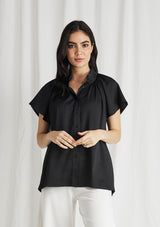 The Cossack Pant by Mela Purdie features in the Shimmer Twill fabrication. This designer top features a mandarin collar, short sleeves with a raglan cut, and a button-down front. The Shimmer Twill fabrication is a non-stretch fabrication that has a soft handle and shimmer finish.