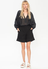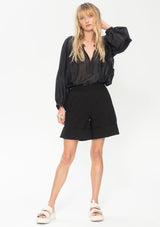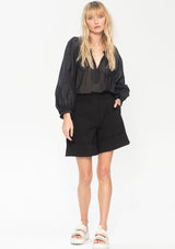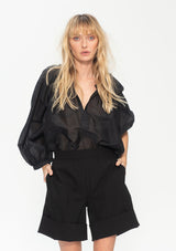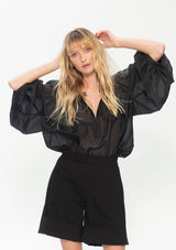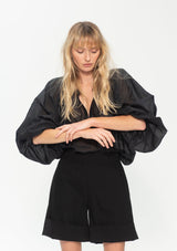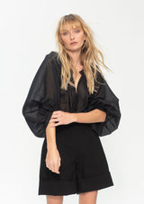 The Escape Blouse from Mela Purdie features a flattering neckline with an option to wear open as a V-neck or single button up for a rounded finish. Gathering and fixed cuffs enhance the billowy shape of the sleeves, allowing you to have some fun with your styling. This relaxed blouse is crafted from Silk Cotton Voile, providing a Cotton air with a silky touch, floating like whipped cream with a sheen lustre and beautiful drape.