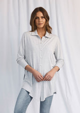 The Sprint Shirt from Mela Purdie features a button-up front with collar, long sleeves with cuff, and a relaxed body with curved high-low hemline. This designer top is crafted from Mela’s stretch fabrication, Matte Jersey.