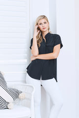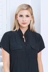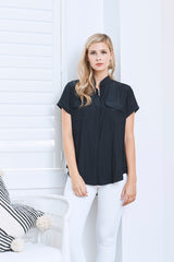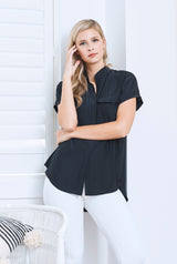 The Mela Purdie Stand Collar Blouse is crafted from Macro-Mousseline, a silky non-stretch fabrication. Ideal for travelling, this top features a button-down front, neat standing collar, and short sleeves.
