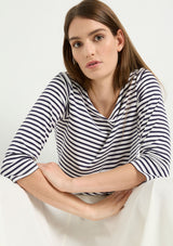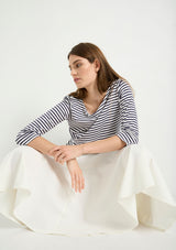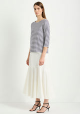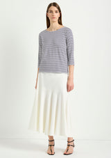 The Straw Stripe Jersey Relaxed Boatneck from Mela Purdie features a boat neckline with a ¾ length sleeve and a relaxed fit that falls to the hip. This is a must have essential for every wardrobe, offering optimal comfort and stretch. Crafted from a mid-weight knit jersey fabrication in the timeless Straw Stripe.