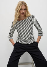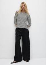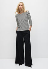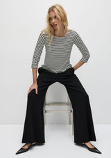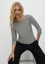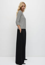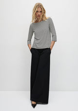 The Straw Stripe Jersey Relaxed Boatneck from Mela Purdie features a boat neckline with a ¾ length sleeve and a relaxed fit that falls to the hip. This is a must have essential for every wardrobe, offering optimal comfort and stretch. Crafted from a mid-weight knit jersey fabrication in the timeless Straw Stripe