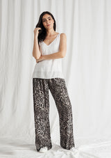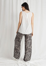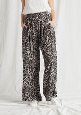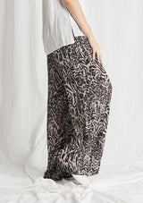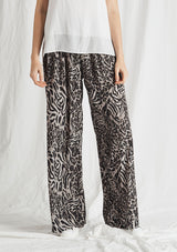 The Maxi Explorer Pant in Tigress Print features in a long wide leg design, with a gathered elastic waistband that sits on the hips. This dress pant is crafted from a 100% Technical Polyester that is similar to Mela’s popular Macro-Mousseline fabrication.