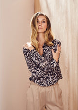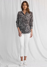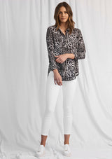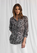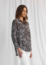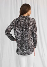 The Soft Shirt in Tigress Print by Mela Purdie features an open collar, button front with cover and long sleeves with button cuff. This designer top is crafted from a 100% Technical Polyester that is similar to Mela’s popular Macro-Mousseline fabrication.