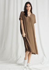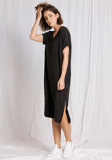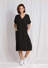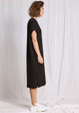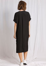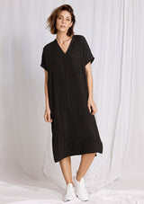 The Wedge Over-Dress from Mela Purdie Features a short sleeves, v-neckline, pleat detailing down the back and a long relaxed box shape silhouette, which falls below the knee. Crafted from Mela’s technical polyester Mache, it offers a fuller bodied, high fashion look that combines style and comfort in a user-friendly fabrication that is machine washable and ideal for travel.