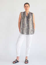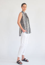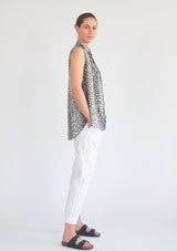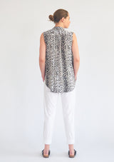 The Mela Purdie Gravity Tank features gathering through the shoulder and a petite stand collar. The sleeveless shirt armhole creates substantial coverage and a long flowing curved hemline. Featured in the Wild Animal Stripe; a classic animal print in white, black and ginger tones. Crafted from Chiffon Satin, a light- weight non-stretch fabrication, that offers a subtle satin finish.