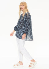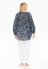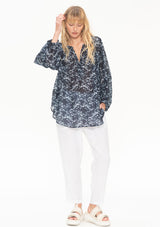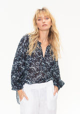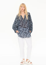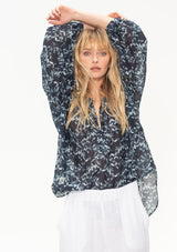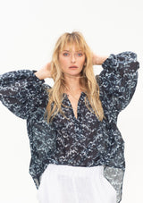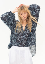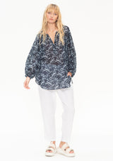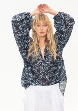 The Escape Blouse from Mela Purdie features a flattering neckline with an option to wear open as a V-neck or single button up for a rounded finish. Gathering and fixed cuffs enhance the billowy shape of the sleeves, allowing you to have some fun with your styling. This relaxed fit blouse is crafted from Silk Cotton Voile, providing a Cotton air with a silky touch and designed in Willow Print, evoking feelings of summer holidays with silhouettes that feel comfortable and carefree.
