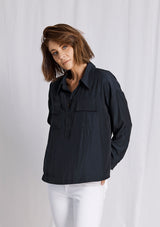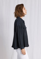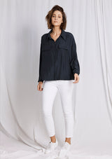 The Mela Purdie Hepburn Shirt features a collared v-neckline with front button detailing, a drop shoulder silhouette with long sleeves and front pockets across the chest. The Hepburn Shirt has been crafted from Mela Purdie’s non-stretch fabrication, Maché.