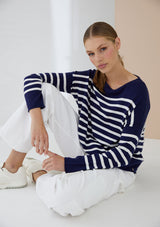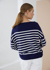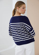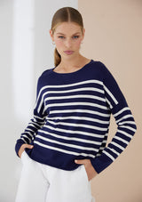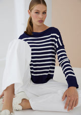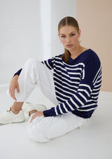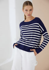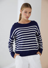 The Como Stripe Crew from Mia Fratino features a crew neckline, drop shoulders, full length sleeves and contrast colour striped detail. Crafted from a premium cotton, silk and cashmere blend fabrication, this classic crew is a lightweight knit for all seasons.