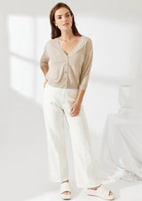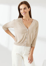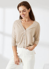 The Natalya Cardi from Mia Fratino features a flattering V neckline, 5 button closure, elbow length sleeves and ribbed trim detail. Crafted from a premium cotton, silk and cashmere blend fabrication, this classic cardigan is a lightweight knit for all seasons.
