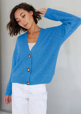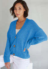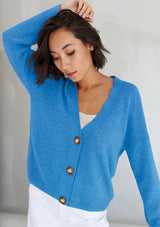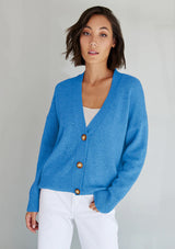 The Thea Button Cardi by Mia Fratino features rib detail on the cuffs and hemline. Knitted in a super cosy 8G structure, made from 100% Mongolian cashmere. This flattering cardi has been designed to sit on the hip. Easy wear over high waisted pants or skirts across all seasons.