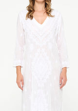 The Goa Dress from One Season has a hand embroidered look and is a contemporary take on the classic kaftan featuring a deep V-neckline and side splits for long walks or lounging. All-over embroidery adorns the longer style cover-up.